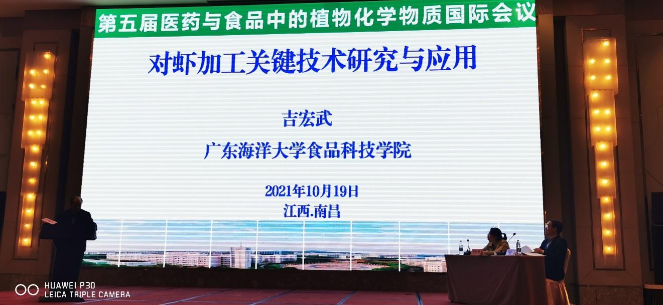 在5-ISPMF会议上,吉宏武教授作了《对虾加工关键技术研究与应用》的报告,介绍了团队10多年在对虾加工基础理论、技术创新、新产品创制和自动生产线创建等方面的研究进展;陈雷博士主持了第1天第二场的大会报告,并作了题为 《微乳胶囊化的二氢杨梅素减轻饮食诱导的代谢综合症》的报告,介绍了二氢杨梅素经微乳液包载后对高脂饮食小鼠的膳食干预作用的研究进展;钟赛意教授的博士研究生陈菁参加线上博士学生论坛并作了《Preparation, structural features and antithrombotic activity of heparinoids from shrimp head》的报告,介绍了虾头类肝素的制备及部分结构特征,并在体内外活性评价中显示出良好的抗血栓作用;吉宏武教授的硕士研究生韦柳益作了《Hypouricemic, hepatoprotective and nephroprotective roles of oligopeptides derived from Auxis thazard protein in hyperuricemic mice》的报告,介绍了扁舵鲣鱼降尿酸肽的制备及其在高尿酸血症动物模型体内活性评价研究进展,并获得了研究生论坛的最佳优秀奖。