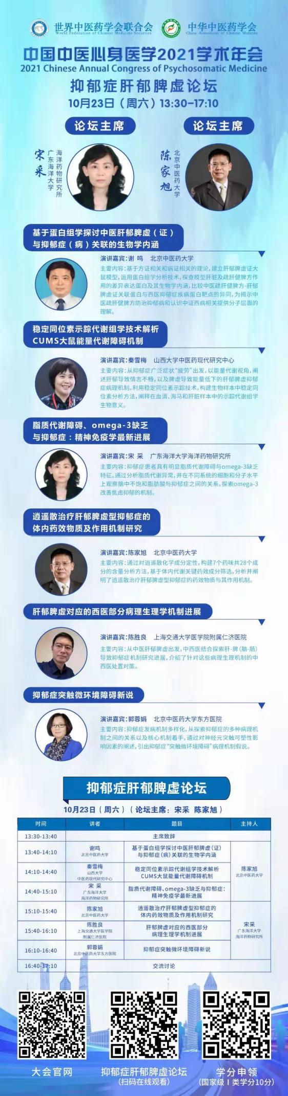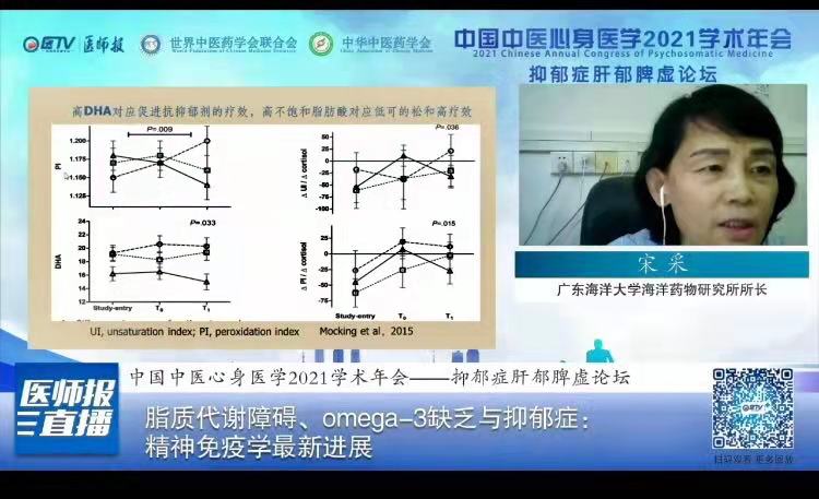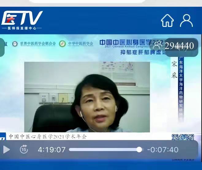 我校williamhill中国海洋药物研究所宋采教授(心身医学分会副会长)受邀在线上主持了抑郁症肝郁脾虚论坛并做了题为“脂质代谢障碍、Omega-3缺乏与抑郁症:精神免疫学最新进展”的报告。本论坛邀请了来自北京中医药大学、上海交通大学、山西大学和威廉williamhill等单位的6名专家做报告。论坛从蛋白组学、代谢组学、脂质代谢、中药辩证诊断和治疗以及线粒体和突触微环境等方面揭示了肝脾功能失调在抑郁症发病和发展的内涵以及与中医诊断和治疗的切合点。人民日报、光明网中医频道、中国青年网、腾讯新闻、《中国临床医生杂志》、中国教育网络电视台在线播放,观看人数近30万。此论坛在将中医药国际化和开创中西医共同研究和治疗抑郁症方面起到了重要的影响。