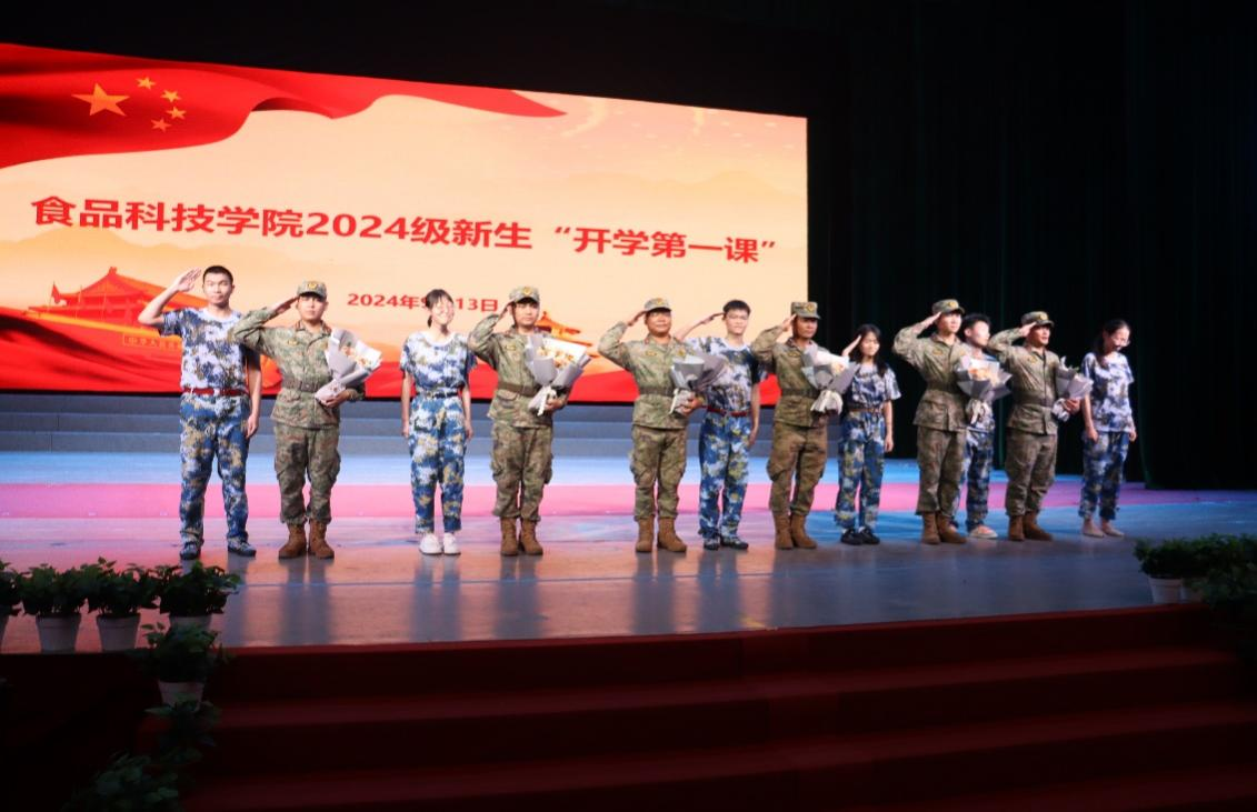 9月13日,在本科新生入学教育活动上,本次军训的全体教官震撼入场,气势如虹,新生代表献花致谢。