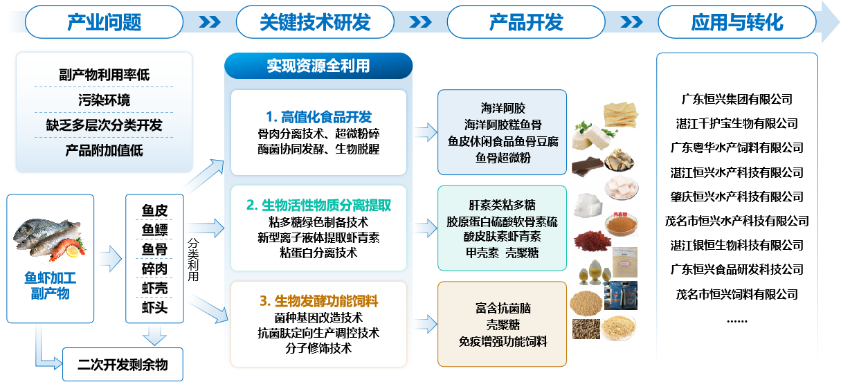 该项目针对鱼虾加工副产物资源利用率低,缺乏多层次综合开发以及产品附加值低等瓶颈问题,构建了鱼虾加工副产物高质食品开发、活性功能因子绿色制备以及残余物生物发酵制备营养功能性饲料添加剂等多层次、多途径高效全利用模式。该成果解决了制约鱼虾副产物高值化利用的技术难题,项目成果已在广东湛江、茂名、肇庆等多家企业进行了推广应用,有力推动了我省鱼虾加工副产物的增值利用,对减少资源浪费,降低企业成本,增加企业经济效益,减少环境污染做出了积极贡献。