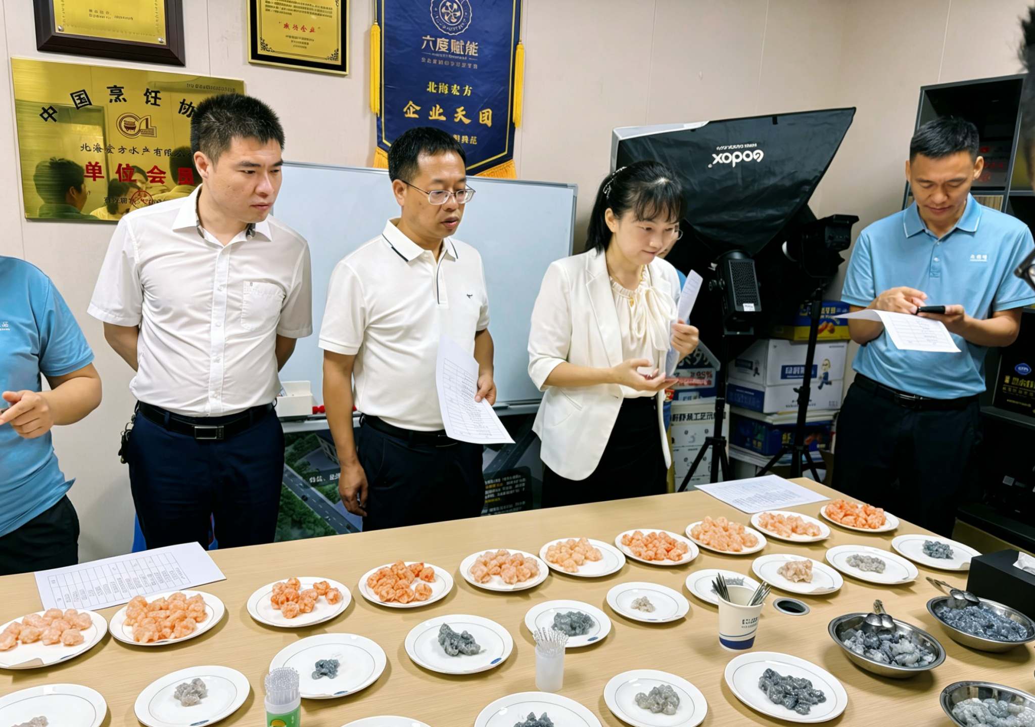 双方围绕“良德源”虾滑产品开展专题品鉴,从原料特性、加工工艺、质构调控、风味保持及冷链适配性等方面,深入剖析了产品的优势与不足。刘书成教授团队结合虾滑加工的原料选择、加工技术、工艺参数与控制等方面,提出了针对性的工艺优化方案和质量改进建议。双方还就技术研发、产品迭代、产业服务、人才培养等议题进行了广泛交流。