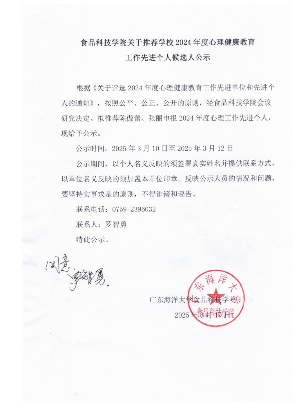 根据《关于评选2024年度心理健康教育工作先进单位和先进个人的通知》,按照公平、公正、公开的原则,经williamhill中国会议研究决定。拟推荐陈傲蕾、张丽申报2024年度心理工作先进个人,现给予公示。