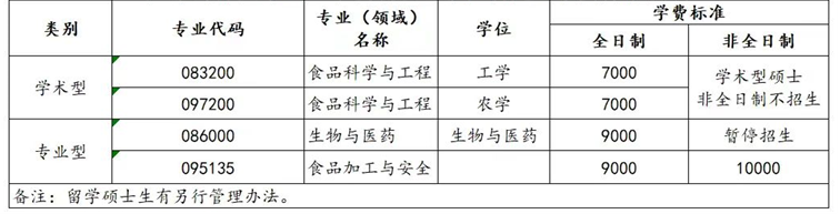 学院具有“学士、硕士、博士””完整学位授权体系。现有食品科学与工程一级学科博士学位授权点、食品科学与工程一级学科硕士学位授权点、农业硕士(食品加工与安全领域)和生物与医药工程硕士2个专业硕士学位授权点,有食品科学与工程、食品质量与安全、生物工程3个本科专业。