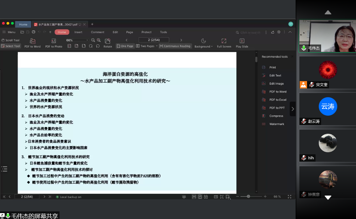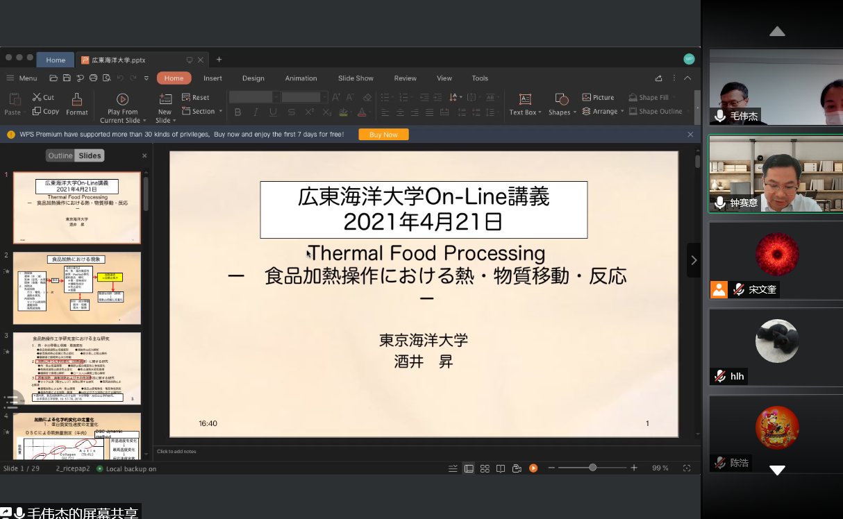 4月21日下午,东京海洋大学任惠峰、酒井昇教授应williamhill中国邀请通过腾讯会议线上作了题为《海洋蛋白资源的高值化——水产品加工副产物高值化利用技术的研究》和《Thermal Food Processing食品加热过程中热・物质移动以及反应》的学术报告。报告由钟赛意教授主持,学院部分教师及研究生60余人参加了报告会。