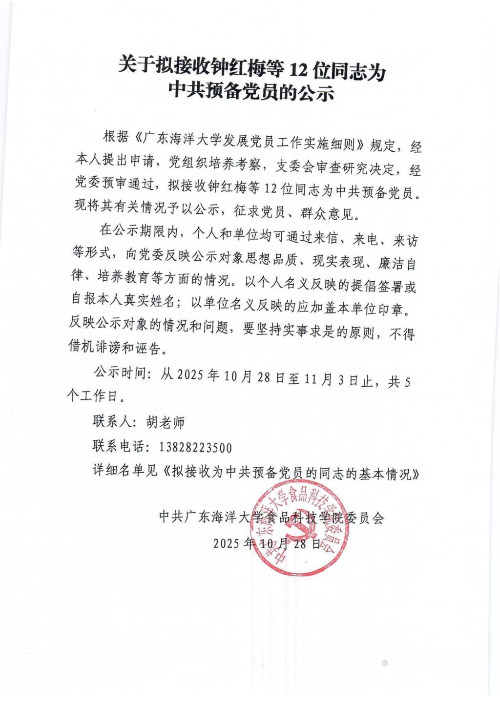 关于拟接收钟红梅等12位同志为中共预备党员的公示