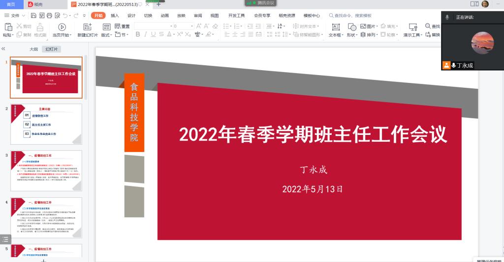 为进一步落实学校疫情防控要求,推动2022届毕业生就业创业工作,提升学生教育管理质量,全面筑牢安全防线, 确保校园安全稳定 ,5月13日晚,williamhill中国利用腾讯会议室召开2022年春季学期班主任工作会议,会议由学院党委副书记丁永成主持,学院副院长夏杏洲、赵云涛和全体班主任、辅导员共32人出席会议。